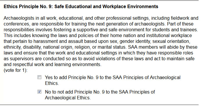 And as long as I seem to be talking myself into supporting this measure (thanks in part to the comments posted above), I also see the benefit of including the new principle for purposes of teaching and education. When I teach about archaeological ethics, I usually start with the SAA principles. If the new principle is added, it could potentially encourage someone being harassed to speak up and rectify the position, which would be a positive thing.
