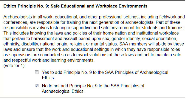 It's true, ethics guidelines are largely toothless statements about a group's greater goals. But default language matters. If we adopt the SAA ethics proposal 9, then future lab leaders, project directors, and ethics class instructors will have to actively ignore this provision if they don't want to discuss it because it's unpleasant; greater discussion of these issues in people's archaeological education and career makes it clearer that "jerks who do harass students" are not welcome within the archaeological community, in a similar fashion to how the current ethics proposals make it clear that the archaeological community should be opposed to markets for antiquities. That's how proposal 9 would change the actions of future archaeologists.